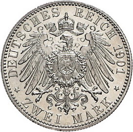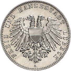 Los-Nummer: Auktion 51 - 2623 Münzen des Deutschen Kaiserreichs Lübeck 2 Mark 1901 A. Jaeger 80. Prachtexemplar. Fast Stempelglanz Schätzpreis: 300,- Zuschlag: unverkauft |
