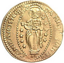 Los-Nummer: Auktion 51 - 3408 Ausländische Münzen und Medaillen Malta Jean de la Vallete 1557-1568, Zecchino. Heiliger und kniender Doge / Christus in Mandorla. Restelli/Sammut 1, Friedberg 9. GOLD. Henkelspur, sehr schön Schätzpreis: 600,- Zuschlag: 570,- |