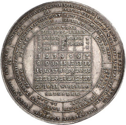 Los-Nummer: Auktion 51 - 1929 Altdeutsche Münzen und Medaillen Würzburg, Bistum Franz Ludwig von Erthal 1779-1795, Kalendermedaille 1780, unsigniert. Innerhalb von zwei Schriftkreisen Quadrat mit den Sonntagen des Jahres 1780 / Sieben Kreisringe mit verschiedenen Kalenderangaben. Helmschrott 877, Slg. Piloty 1282 , Strothotte 1780-3, vergl. Auktion UBS 52, September 2002, Nr. 1495. Schöne Patina. Vorzüglich + Schätzpreis: 600,- Zuschlag: 520,- |