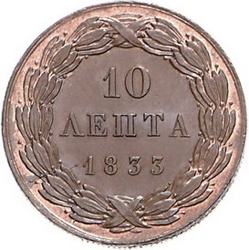 Los-Nummer: Auktion 51 - 3055 Ausländische Münzen und Medaillen Griechenland Otto von Bayern 1832-1863, Cu 10 Lepta 1833, München. Divo 18 a, K.M. 17. Vorzüglich - Stempelglanz Schätzpreis: 300,- Zuschlag: 270,- |