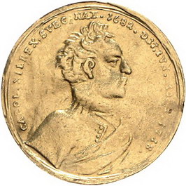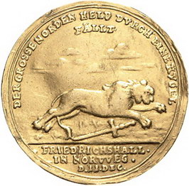 Los-Nummer: Auktion 51 - 1403 Altdeutsche Münzen und Medaillen Pommern-unter schwedischer Besetzung Karl XII. 1697-1718, Doppeldukat 1718. Auf seinen Tod. Brustbild nach rechts / Toter Löwe neben Schwert. S.B. -, Slg. Pogge 690, Slg. Bratring -, Friedberg - , Hildebrand 210 a. GOLD. Fassungsspuren, poliert, fast sehr schön Schätzpreis: 300,- Zuschlag: 575,- |