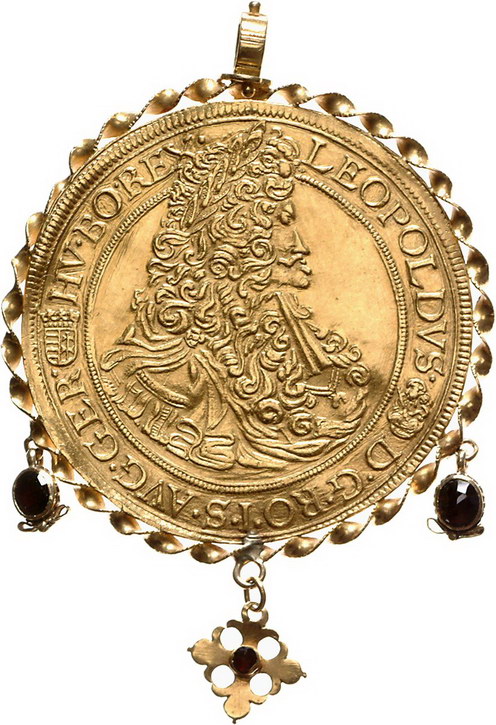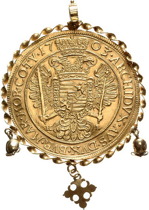 Los-Nummer: Auktion 51 - 2067 Haus Habsburg Haus Habsburg Leopold I. 1657-1705, 5 Dukaten 1703 Nagybanya. Goldabschlag von den Stempeln des Talers. Herinek 134, Friedberg 174 (ungenau), Huszár 1295. GOLD. Mit alter Zierfassung. Felder geglättet, sehr schön Schätzpreis: 1500,- Zuschlag: 3250,- |
