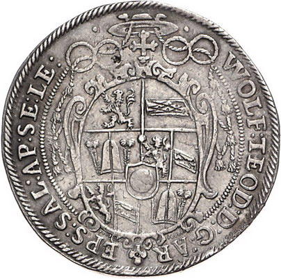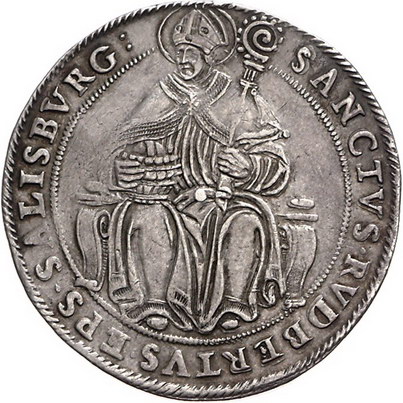Los-Nummer: Auktion 51 - 2232 Haus Habsburg Salzburg, Erzbistum Wolf Dietrich von Raitenau 1587-1612, Taler o.J. Sitzender St. Rudbertus mit Salzfass und Krummstab / Verziertes Wappen unter Legatenhut. Probszt 826, Davenport 8184. Schöne Patina. Sehr schön - vorzüglich Schätzpreis: 175,- Zuschlag: 170,- |