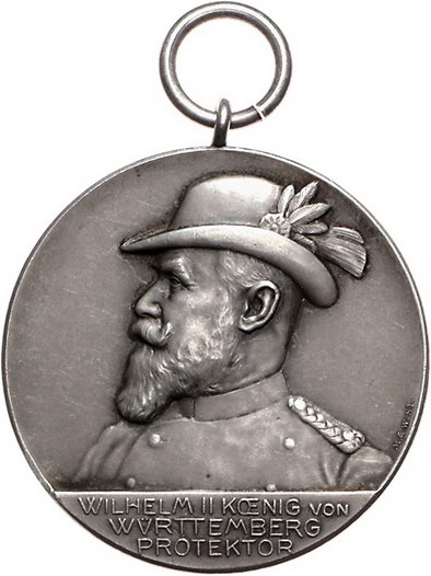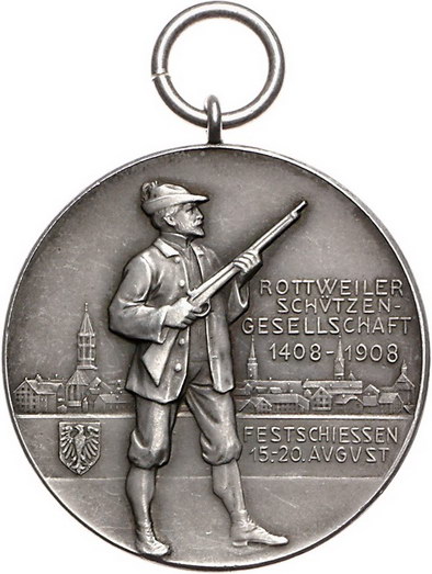 Los-Nummer: Auktion 51 - 1491 Altdeutsche Münzen und Medaillen Rottweil, Stadt Tragbare Medaille 1908, von Mayer und Wilhelm. Auf das Festschießen der Schützengesellschaft anlässlich ihres 500jährigen Bestehens. Brustbild König Wilhelm II. in Schützentracht über drei Zeilen Schrift nach links / Schütze mit Gewehr vor Stadtansicht. 40 mm, 25,10 g. Originalöse. Mattiert. Vorzüglich + Schätzpreis: 150,- Zuschlag: unverkauft |