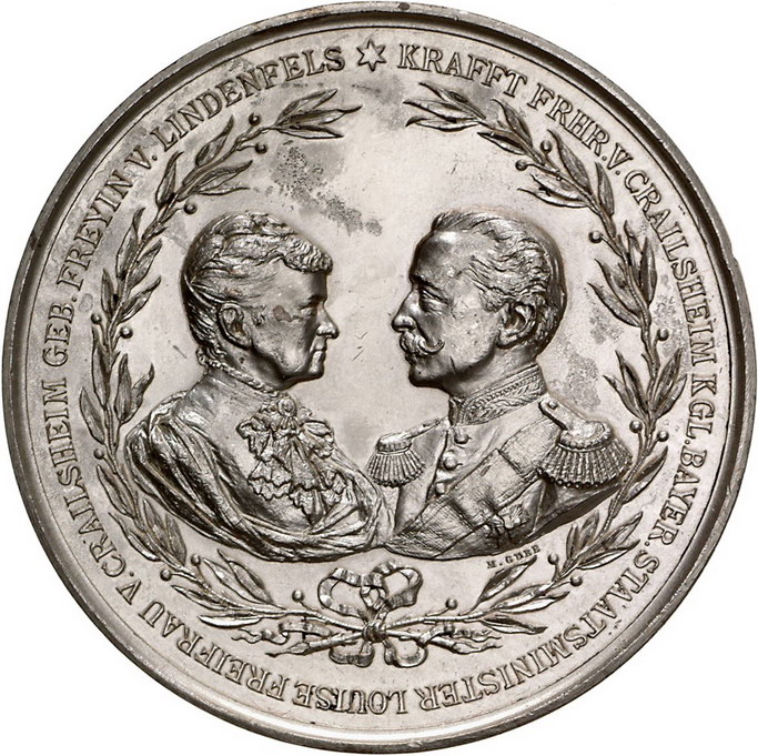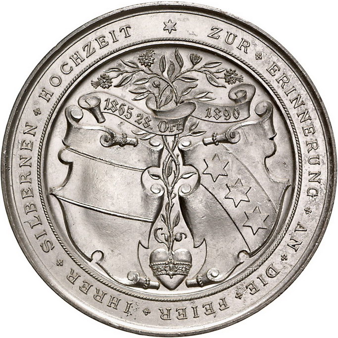 Los-Nummer: Auktion 51 - 1901 Altdeutsche Münzen und Medaillen Württemberg-Crailsheim, Stadt Versilberte Bronzemedaille 1890, von Gube. Auf die Silberhochzeit von Krafft Freiherr von Crailsheim (*1841 Ansbach), königlich bayerischer Staatsminister und Luise, geborene Freyin von Lindenfels. Die Brustbilder des Paares zwischen Lorbeerzweigen einander gegenüber / Zwei Wappen, dazwischen Herz aus dem Blüten wachsen. Hauser 217. 70 mm. Winz. Randfehler, winz. Kratzer, vorzüglich Schätzpreis: 150,- Zuschlag: 170,- |