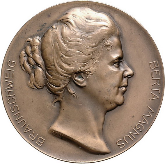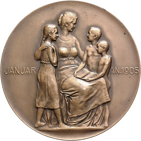 Los-Nummer: Auktion 51 - 2293 Medaillen Judaica Braunschweig Bronzemedaille 1905, von Gottlieb Elster, Berlin. Auf Berta Magnus, Gattin des Braunschweiger Rechtsanwaltes und Notars Carl Magnus. Kopf nach rechts / Sitzende Mutter umgeben von ihren drei Kindern. Forrer Bd. 7, Seite 251. 69,5 mm. Winz. Kratzer, vorzüglich Schätzpreis: 125,- Zuschlag: unverkauft |