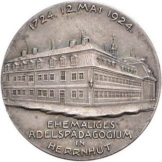 Los-Nummer: Auktion 51 - 1617 Altdeutsche Münzen und Medaillen Sachsen-Herrnhut, Gemeinde Medaille 1924. Auf die 200-Jahrfeier des ehemaligen Adelspädagogiums. Brustbild des Grafen von Zinzendorf von vorn / Gebäudeansicht. 33 mm, 13,91 g. Mattiert. Prägefrisch Schätzpreis: 125,- Zuschlag: 130,- |