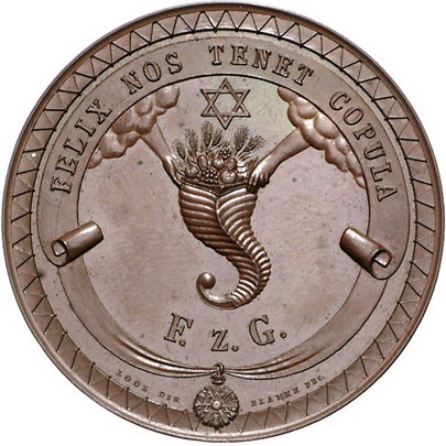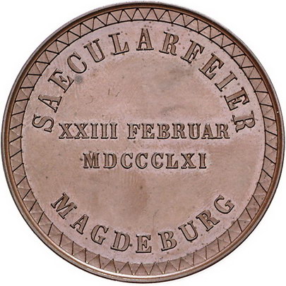 Los-Nummer: Auktion 51 - 1030 Altdeutsche Münzen und Medaillen Magdeburg, Stadt Bronzemedaille 1861, von Blanke. Auf das 100jährige Bestehen der Loge 'Ferdinand zur Glückseligkeit'. Füllhorn / Schrift. HZC 125, Slg. Peltzer 296. 41,5 mm. Fast Stempelglanz Schätzpreis: 75,- Zuschlag: 90,- |