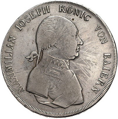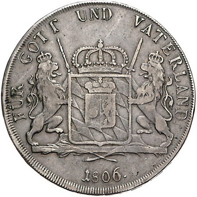 Los-Nummer: Auktion 51 - 118 Altdeutsche Münzen und Medaillen Bayern Maximilian I. Joseph 1806-1825, Königstaler 1806. Löwen schauen nach innen. Jaeger 3, Thun 40, AKS 45, Kahnt 65. Sehr schön Schätzpreis: 350,- Zuschlag: unverkauft |