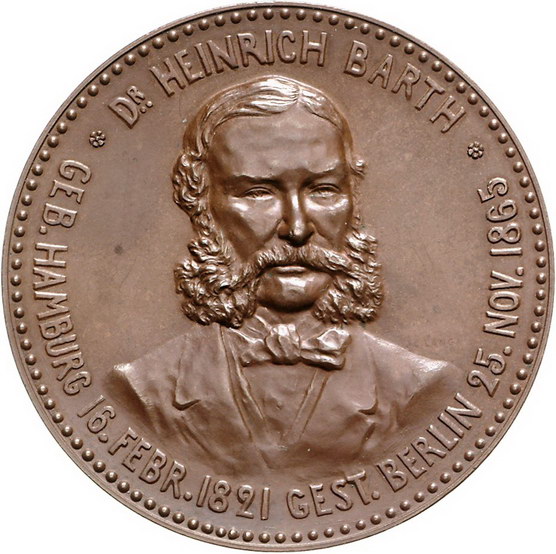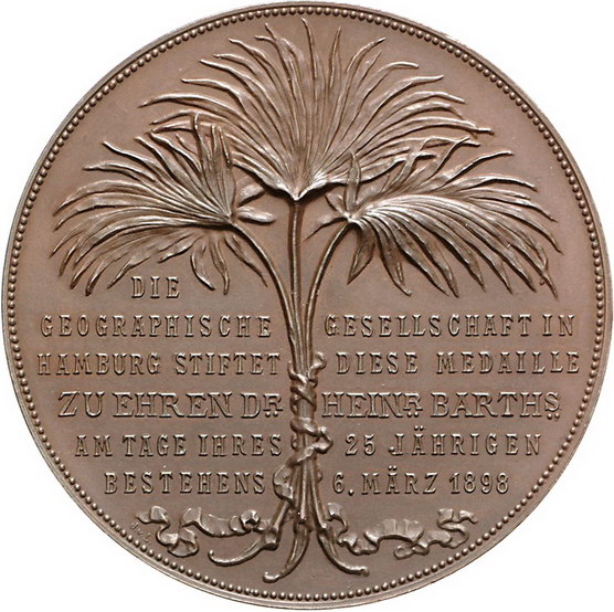 Los-Nummer: Auktion 51 - 887 Altdeutsche Münzen und Medaillen Hamburg-Stadt Bronzemedaille 1898, von Langa. Auf das 25jährige Bestehen der geographischen Gesellschaft. Brustbild Dr. Heinrich Barths (*1821 Hamburg, +1865 Berlin) von vorn / Palmblätter zwischen sechs Zeilen Schrift. 56,5 mm. Vorzüglich - prägefrisch Schätzpreis: 125,- Zuschlag: unverkauft |