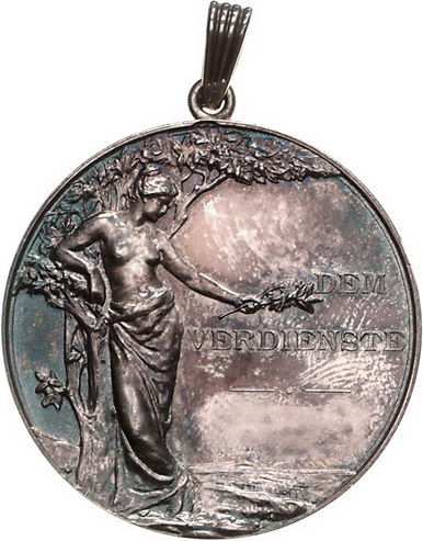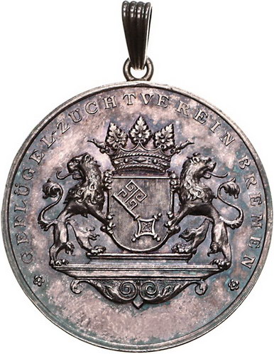 Los-Nummer: Auktion 51 - 708 Altdeutsche Münzen und Medaillen Bremen, Stadt Medaillen, Tragbare Medaille o.J., Prämie des Geflügelzuchtvereins. Weibliche Person mit Lorbeerzweig in ihrer Linken lehnt an Baum, rechts zwei Zeilen Schrift / Zwei Löwen halten gekröntes Bremer Wappen. 39,5 mm, 22,59 g. Etui. Kl. Randfehler, vorzüglich - prägefrisch Schätzpreis: 125,- Zuschlag: 100,- |