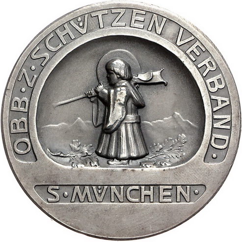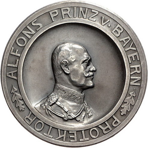 Los-Nummer: Auktion 51 - 153 Altdeutsche Münzen und Medaillen Bayern-München, Stadt Versilberte Bronzemedaille o.J. Auf Prinz Alfons von Bayern, Protektor des oberbayerischen Zimmerstutzen-Schützenvereins. Brustbild in Uniform nach rechts / In vertieftem Halbrund Münchner Kindl mit Gewehr vor bergiger Landschaft. Peltzer 1470. 50,5 mm. Mattiert. Vorzüglich + Schätzpreis: 150,- Zuschlag: unverkauft |