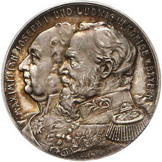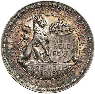 Los-Nummer: Auktion 51 - 148 Altdeutsche Münzen und Medaillen Bayern Ludwig III. 1913-1918, Medaille 1918. Auf die 100-Jahrfeier der bayerischen Verfassung. Die Brustbilder Maximilian Josephs I. und Ludwigs III. in Uniformen nebeneinander nach links / Bayerischer Löwe mit gekröntem Rautenschild. 33 mm, 14,43 g. Schöne Patina. Stempelglanz Schätzpreis: 125,- Zuschlag: 110,- |