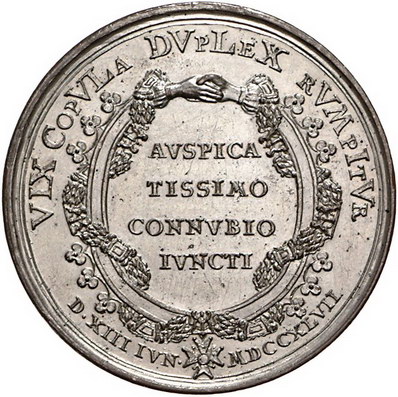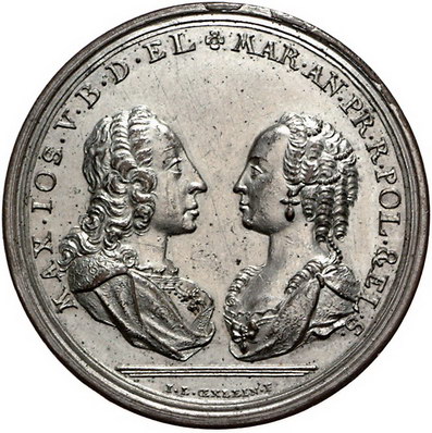 Los-Nummer: Auktion 51 - 109 Altdeutsche Münzen und Medaillen Bayern Maximilian III. Joseph 1745-1777, Versilberte Bronzemedaille 1747, von Oexlein. Auf die Vermählung mit Maria Anna, der Tochter Friedrich Augusts von Sachsen und Polen. Die beiden Brustbilder einander gegenüber / Von Ordenskette umwundenes Band, das oben in zwei einander gereichten Händen endet, mittig vier Zeilen Schrift. Wittelsbach 2133 , Slg. Merseburger 1843. 40,5 mm. Kl. Kratzer, vorzüglich Schätzpreis: 75,- Zuschlag: unverkauft |