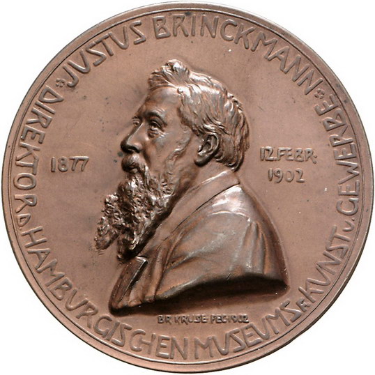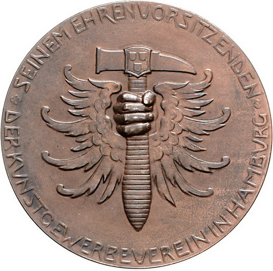 Los-Nummer: Auktion 51 - 889 Altdeutsche Münzen und Medaillen Hamburg-Stadt Bronzemedaille 1902, von Kruse. Auf das 25jährige Dienstjubiläum des Museumsdirektors für Kunst und Gewerbe, Justus Brinkmann. Brustbild nach links / Hand hält geflügelten Hammer. 55 mm. Vorzüglich + Schätzpreis: 125,- Zuschlag: unverkauft |