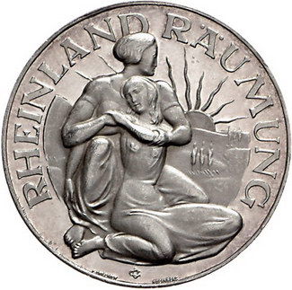 Los-Nummer: Auktion 51 - 2554 Medaillen Weimarer Republik Medaille 1930, von Lauer. Auf die Rheinlandräumung. Zwei weibliche Personen vor Sonnenaufgang / Rhein mit Weinbergen, darüber Regenbogen. 33 mm, 15,17 g. Polierte Platte. Vorzüglich - Stempelglanz Schätzpreis: 75,- Zuschlag: 90,- |