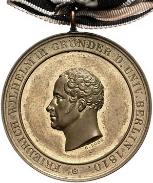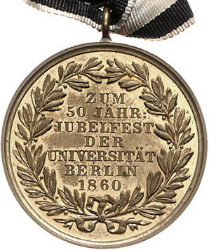 Los-Nummer: Auktion 51 - 2477 Medaillen Universitäten Berlin Tragbare, vergoldete Bronzemedaille 1860, von Loos. Auf die 60-Jahrfeier der Universität. Kopf König Friedrich Wilhelms IV. von Preußen nach links / Schrift zwischen Lorbeerzweigen. 30 mm. An schwarz-weißer Schleife. Vorzüglich - Stempelglanz Schätzpreis: 90,- Zuschlag: unverkauft |