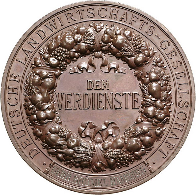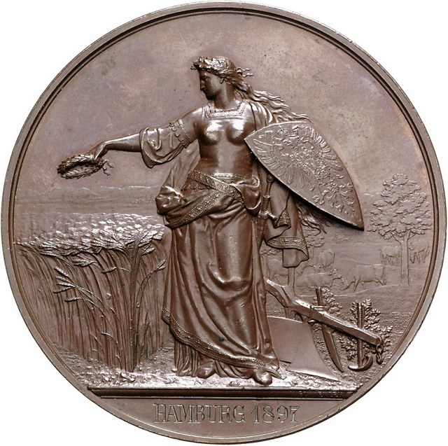 Los-Nummer: Auktion 51 - 886 Altdeutsche Münzen und Medaillen Hamburg-Stadt Bronzemedaille o.J. (graviert 1897), von Schwenzer. Prämie der deutschen Landwirtschafts-Gesellschaft, verliehen an die Gebrüder Brömel, Hamburg (graviert). Germania mit Schild und Speer zwischen Ährenfeld und Pflug, im Hintergrund weidende Kühe / Zwei Zeilen Schrift in Früchtekranz. 65 mm. Vorzüglich + Schätzpreis: 125,- Zuschlag: 100,- |