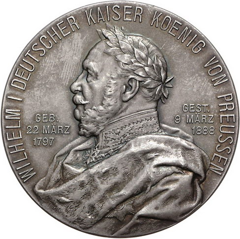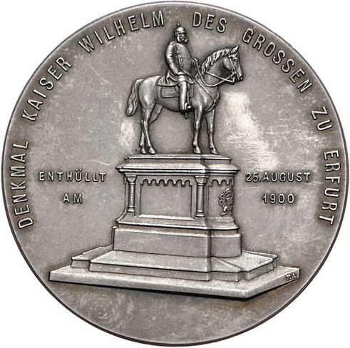 Los-Nummer: Auktion 51 - 773 Altdeutsche Münzen und Medaillen Erfurt, Stadt Medaille 1900, signiert F.A. Auf die Errichtung des Denkmals für Wilhelm I. Belorbeertes Brustbild in Uniform mit Hermelinmantel nach links / Reiterstandbild. 50 mm, 49,93 g. Mattiert. Prägefrisch Schätzpreis: 250,- Zuschlag: 200,- |
