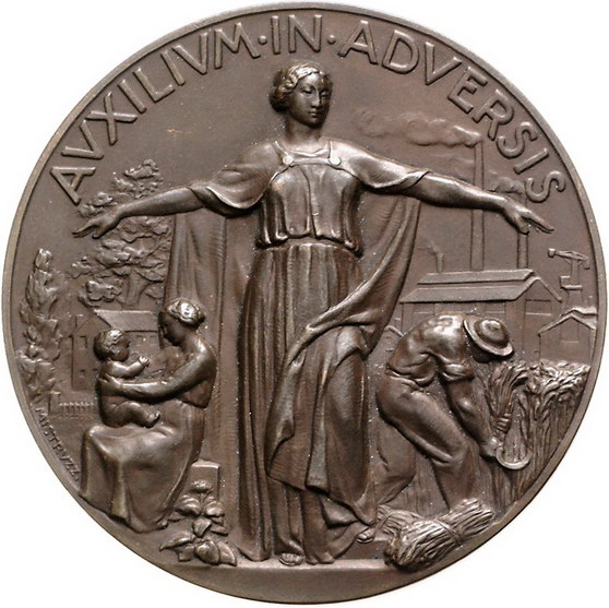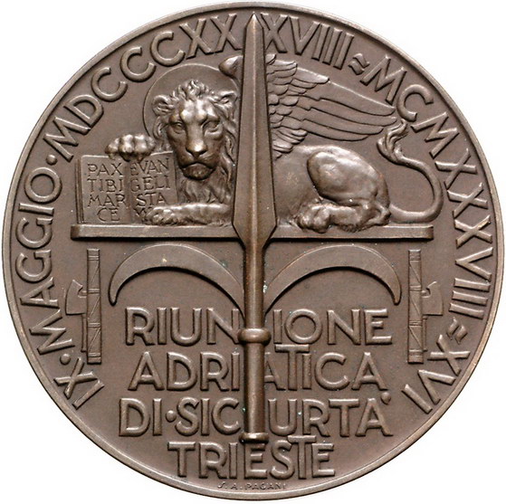 Los-Nummer: Auktion 51 - 3250 Ausländische Münzen und Medaillen Italien-Triest Bronzemedaille 1938, von Mistruzzi. Auf den Adria-Kongress der Versicherung 'Sicurta Trieste' anlässlich ihres 100jährigen Bestehens. Securitas beschützt Mutter mit Kind und Bauern bei der Arbeit / Hellebarde vor Markuslöwe. 57 mm. Vorzüglich Schätzpreis: 75,- Zuschlag: unverkauft |