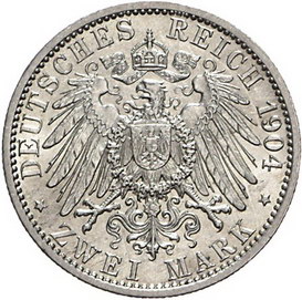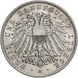 Los-Nummer: Auktion 51 - 2624 Münzen des Deutschen Kaiserreichs Lübeck 2 Mark 1904 A. Jaeger 81. Vorzüglich Schätzpreis: 150,- Zuschlag: unverkauft |