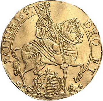 Los-Nummer: Auktion 51 - 1560 Altdeutsche Münzen und Medaillen Sachsen-Albertinische Linie Johann Georg II. 1656-1680, Fünffacher Dukat 1657. Auf das Vikariat. Kurfürst reitet im Kurornat mit geschultertem Schwert auf einem reich geschmückten Pferd nach rechts, zwischen den Läufen das sächsische Wappen / Zwölf Zeilen Schrift. Clauss/Kahnt 475, Slg. Merseburger -, Friedberg - vergl. 2718 , Baumgarten 424. 17,18 g. GOLD. Leichte Fassungsspuren, kl. Schrötlingsfehler, sehr schön - vorzüglich Schätzpreis: 5000,- Zuschlag: 5750,- |