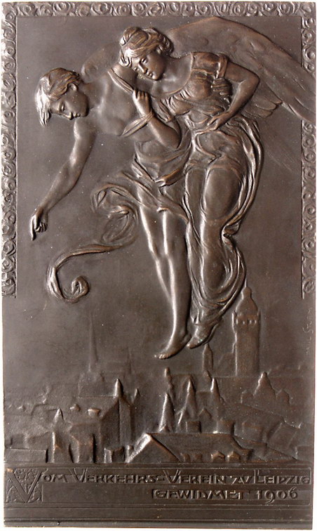 Los-Nummer: Auktion 51 - 2314 Medaillen Kunstmedaillen Sturm, Paul Einseitige Bronzegussplakette#0Medaille# 1906. Widmung des Leipziger Verkehrsvereins. Männlicher geflügelter Genius und weibliche Person schweben über den Dächern von Leipzig. 185 x 111 mm. Vorzüglich + Schätzpreis: 400,- Zuschlag: unverkauft |