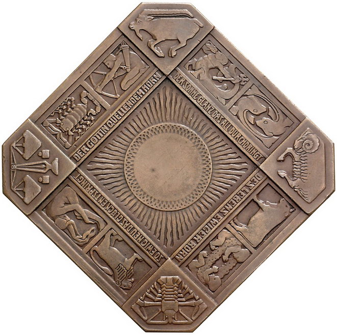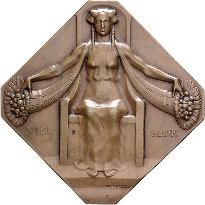 Los-Nummer: Auktion 51 - 2304 Medaillen Kunstmedaillen Bosselt, Rudolf Oktagonale Bronzeplakette#0Medaille# o.J. 'Viel Glück'. Auf hochlehnigem Stuhl sitzende weibliche Person mit zwei Füllhörnern rechts und links / Strahlende Sonne in der Mitte, darum Band aus Tierkreiszeichen. Losse 61. 74 x 64 mm. Winz. Randfehler, vorzüglich Schätzpreis: 400,- Zuschlag: unverkauft |