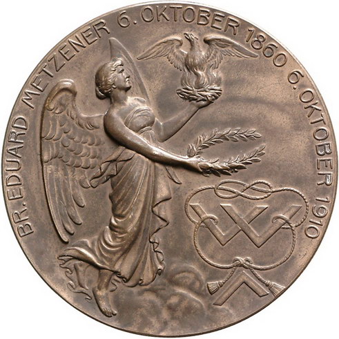 Los-Nummer: Auktion 51 - 2283 Medaillen Freimaurer Mannheim Bronzemedaille 1910, von Mayer und Wilhelm. Zum 50jährigen Jubiläum des Meisters der Andreas-Loge 'Corona', Eduard Metzener. Brustbild mit Logenorden von vorn / Schwebende weibliche Gestalt mit Lorbeerkranz in der rechten Hand und Phönix im Nest in der Linken. 60 mm. Kl. Kratzer, vorzüglich Schätzpreis: 100,- Zuschlag: unverkauft |