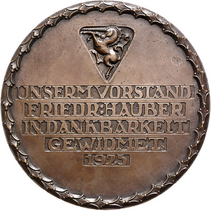 Los-Nummer: Auktion 51 - 1773 Altdeutsche Münzen und Medaillen Schwäbisch Gmünd, Stadt Bronzegussmedaille 1923, von Alfons Feuerle. Widmung des Kunstgewerbevereins 'Vorwärts' ihrem Vorstand Friedrich Hauber (*1867 Schwäbisch Gmünd, +1926 Gundelsheim/Württemberg). Fortuna mit Füllhorn und Lorbeerzweig in antikem Gewand reitet nach links / Fünf Zeilen Schrift unter Stadtwappen (Einhorn). 96,5 mm. Originaletui. Vorzüglich - gussfrisch Schätzpreis: 350,- Zuschlag: unverkauft |