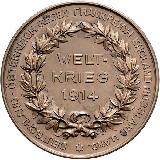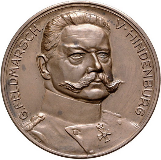 Los-Nummer: Auktion 51 - 2538 Medaillen Erster Weltkrieg Personenmedaillen Hindenburg, Paul von Beneckendorff und von *1847 Posen, +1934 Neudeck/Westpreußen, Bronzemedaille 1914, von Mayer und Wilhelm. Auf die Kriegsgegner Deutschland-Österreich und England, Frankreich und Russland. Brustbild in Uniform halbrechts / Drei Zeilen Schrift in Lorbeerkranz. 54 mm. Winz. Flecken, vorzüglich Schätzpreis: 90,- Zuschlag: unverkauft |