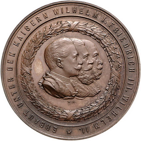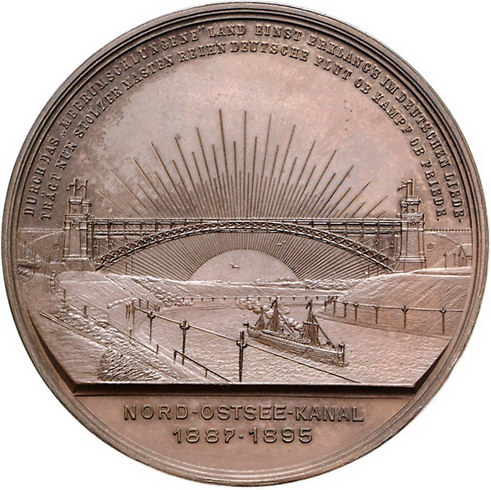 Los-Nummer: Auktion 51 - 1767 Altdeutsche Münzen und Medaillen Schleswig-Nord-Ostsee-Kanal Eröffnungsfeier 1895, Bronzemedaille 1895, von Mayer. Die Brustbilder der drei preußischen Kaiser in Lorbeerkranz nebeneinander nach rechts / Ansicht der Hochbrücke bei Levensau und des Kanals mit Dampfer, darüber bogenförmig zwei Zeilen Schrift. Lange 1373. 50 mm. Winz. Kratzer, vorzüglich Schätzpreis: 175,- Zuschlag: 150,- |