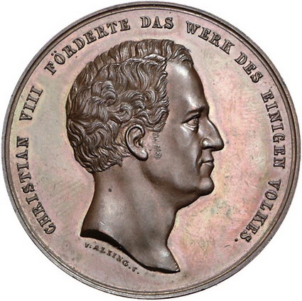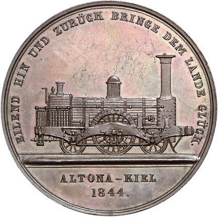 Los-Nummer: Auktion 51 - 1769 Altdeutsche Münzen und Medaillen Schleswig-Kiel, Stadt Bronzemedaille 1844, von Alsing. Auf die Eröffnung der Bahnstrecke zwischen Altona und Kiel. Kopf König Christians III. von Dänemark nach rechts / Dampflokomotive. Döry-Kubinsky 43. 43,5 mm. Vorzüglich - Stempelglanz Schätzpreis: 125,- Zuschlag: 530,- |