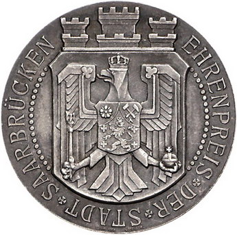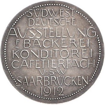 Los-Nummer: Auktion 51 - 1494 Altdeutsche Münzen und Medaillen Saarbrücken, Stadt Medaille 1912. Ehrenpreis der südwestdeutschen Ausstellung für Bäckerei, Konditorei und Cafetierfach. Gekröntes Wappen / Neun Zeilen Schrift. 35 mm, 20,26 g. Mattiert. Winz. Kratzer, vorzüglich - prägefrisch Schätzpreis: 125,- Zuschlag: unverkauft |