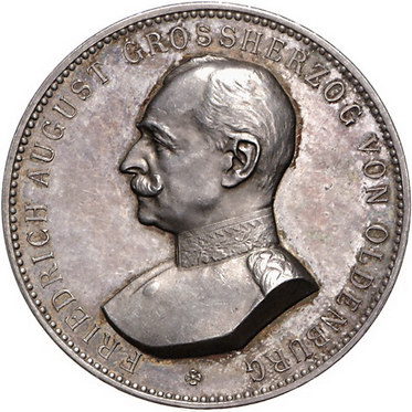 Los-Nummer: Auktion 51 - 1329 Altdeutsche Münzen und Medaillen Oldenburg Friedrich August 1900-1918, Medaille o.J. Für hervorragende Leistungen in der Landwirtschaft. Brustbild in Uniform nach links / Sechs Zeilen Schrift in Kranz. 38 mm, 29,80 g. Winz. Kratzer, vorzüglich Schätzpreis: 250,- Zuschlag: unverkauft |