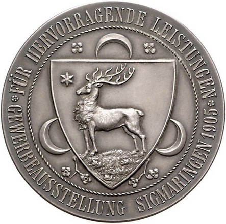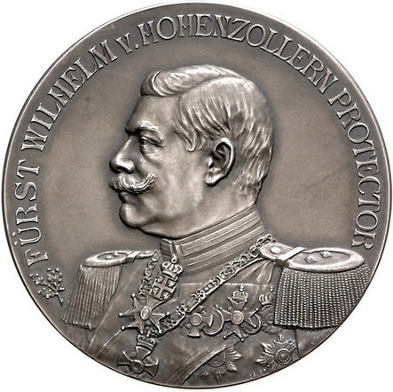 Los-Nummer: Auktion 51 - 940 Altdeutsche Münzen und Medaillen Hohenzollern-Sigmaringen, Stadt Medaille 1905, von Lauer. Preismedaille der Gewerbeausstellung in Sigmaringen. Brustbild des Fürsten Wilhelm von Hohenzollern als Protektor in Uniform nach links / Wappen mit Hirsch zwischen drei Mondsicheln. 45,5 mm, 24,55 g. Mattiert. Prägefrisch Schätzpreis: 300,- Zuschlag: unverkauft |