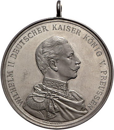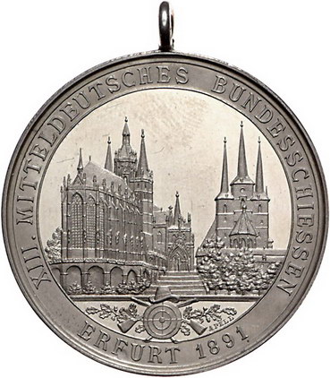 Los-Nummer: Auktion 51 - 771 Altdeutsche Münzen und Medaillen Erfurt, Stadt Tragbare Medaille 1891, von Drentwett. Auf das XIII. Mitteldeutsche Bundesschießen. Ansicht des Doms / Brustbild Kaiser Wilhelms II. in Uniform und Umhang nach rechts. Slg. Peltzer 1047. 37,5 mm, 19,74 g. Originalöse. Vorzüglich - Stempelglanz Schätzpreis: 100,- Zuschlag: 80,- |