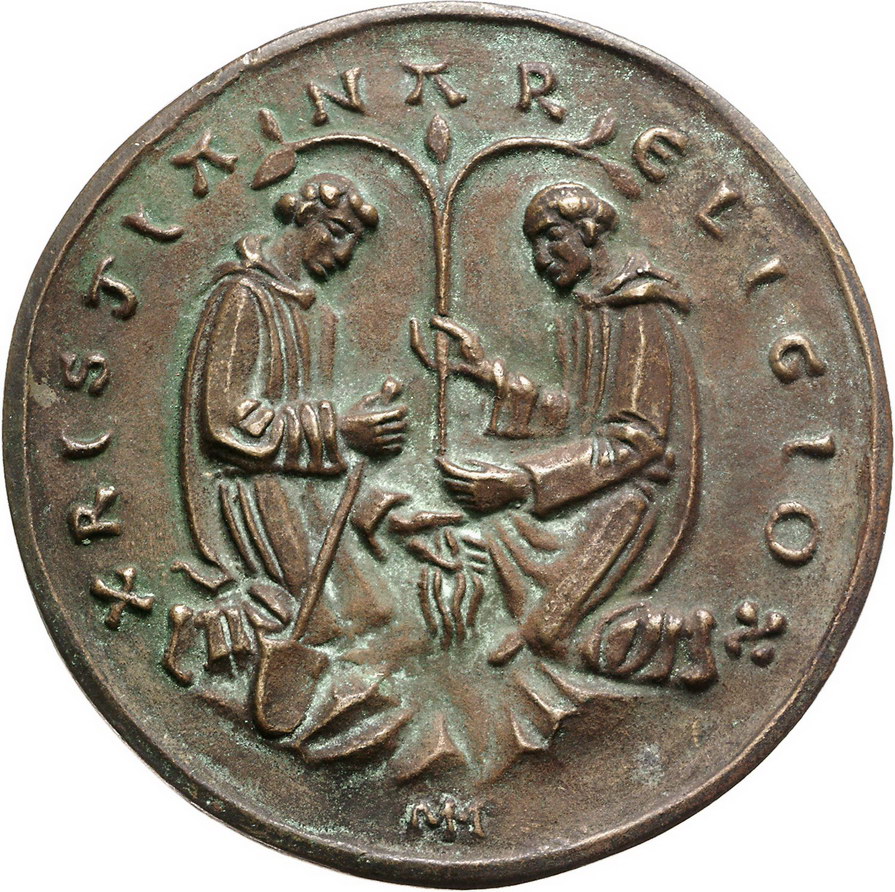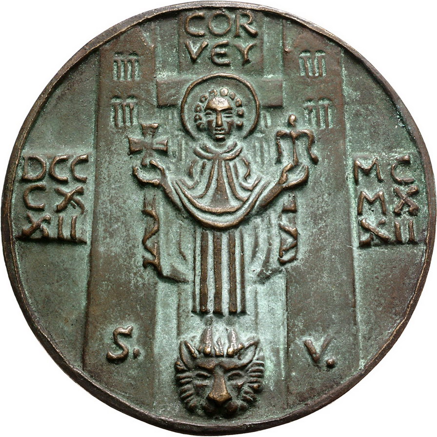 Los-Nummer: Auktion 51 - 718 Altdeutsche Münzen und Medaillen Corvey, Abtei Bronzegussmedaille 1922, signiert MM. Auf die 1100-Jahrfeier der Abtei. Stehender St. Vitus zwischen Jubiläumszahlen / Zwei kniende Mönche pflanzen Baum. 91,5 mm. Grünliche Patina. Vorzüglich Schätzpreis: 250,- Zuschlag: 200,- |