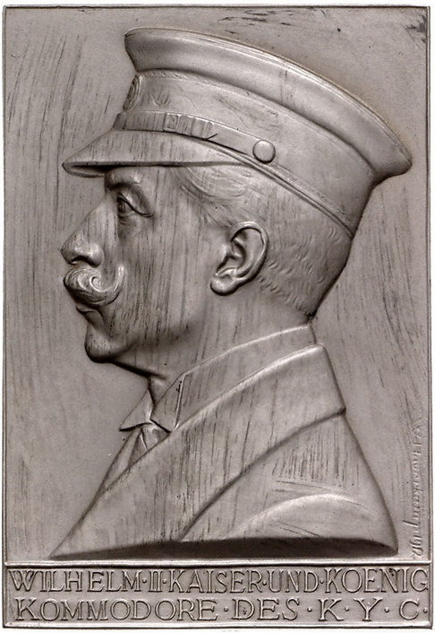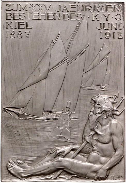 Los-Nummer: Auktion 51 - 587 Altdeutsche Münzen und Medaillen Brandenburg-Preußen Wilhelm II. 1888-1918, Silberplakette#0Medaille# 1912, von Haverkamp. Auf das 25jährige Bestehen des Kieler Yacht-Clubs unter der Schirmherrschaft von Kaiser Wilhelm II. als Kommodore des Clubs. Brustbild in Uniform nach links / Neptun mit Dreizack sitzt am Ufer und betrachtet an ihm vorbeisegelnde Boote. 72,5 x 49,5 mm, 123,81 g. Mattiert. Prägefrisch Schätzpreis: 350,- Zuschlag: unverkauft |