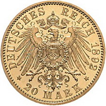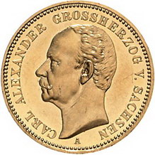 Los-Nummer: Auktion 51 - 2711 Münzen des Deutschen Kaiserreichs Sachsen-Weimar-Eisenach Carl Alexander 1853-1901, 20 Mark 1892 A. Jaeger 282. GOLD. Minimal berieben, Polierte Platte. Schätzpreis: 3250,- Zuschlag: unverkauft |