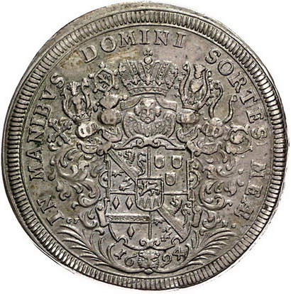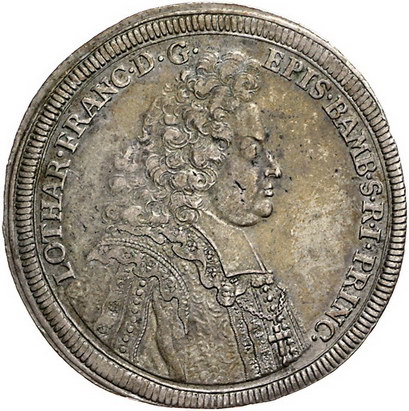 Los-Nummer: Auktion 51 - 90 Altdeutsche Münzen und Medaillen Bamberg, Bistum Lothar Franz von Schönborn 1693-1729, Taler 1694. Krug 368, Heller 293, Davenport 5065. Winz. Schrötlingsfehler, sehr schön + Schätzpreis: 500,- Zuschlag: 650,- |