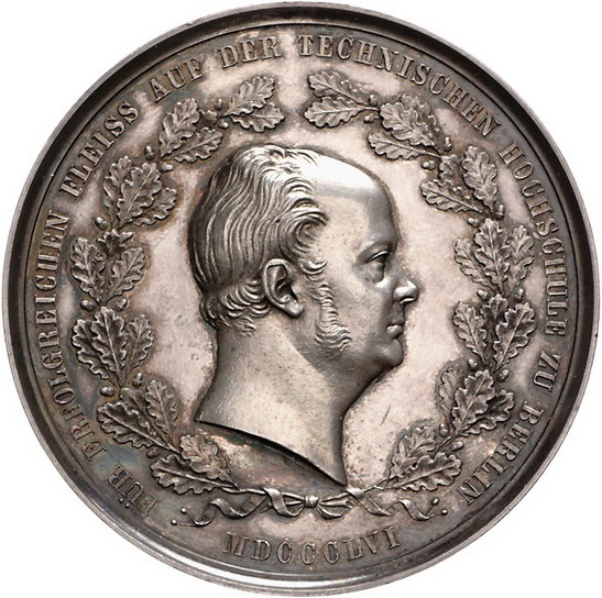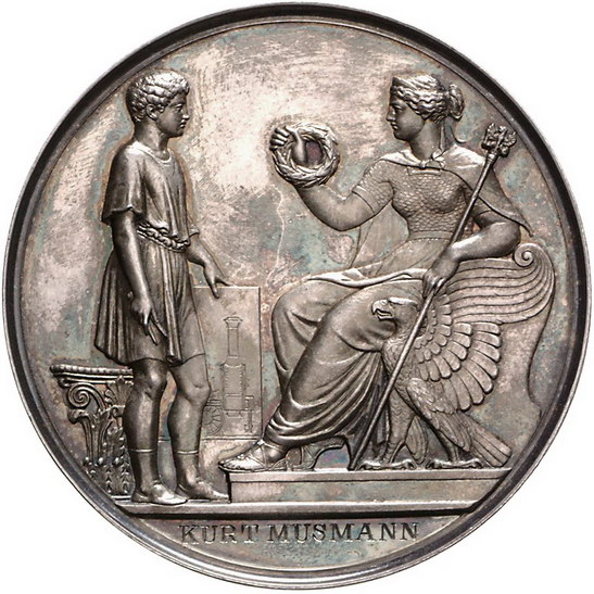 Los-Nummer: Auktion 51 - 568 Altdeutsche Münzen und Medaillen Brandenburg-Preußen Wilhelm I. 1861-1888, Medaille 1856, unsigniert, von Kullrich. Preismedaille der Technischen Hochschule Berlin. Kopf in Eichenkranz nach rechts / Sitzende Göttin überreicht vor ihr stehendem Schüler Lorbeerkranz. Im Abschnitt Gravur mit Namen des Preisträgers. Sommer K 129. 55,5 mm, 75,04 g. Winz. Kratzer, vorzüglich - Stempelglanz Schätzpreis: 350,- Zuschlag: 280,- |