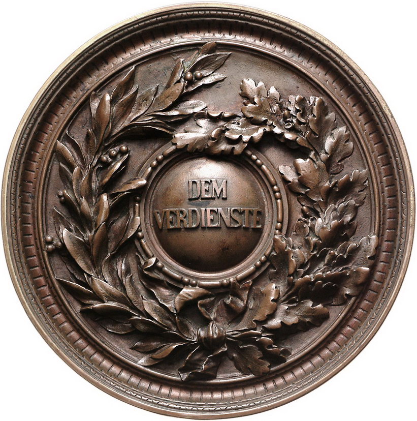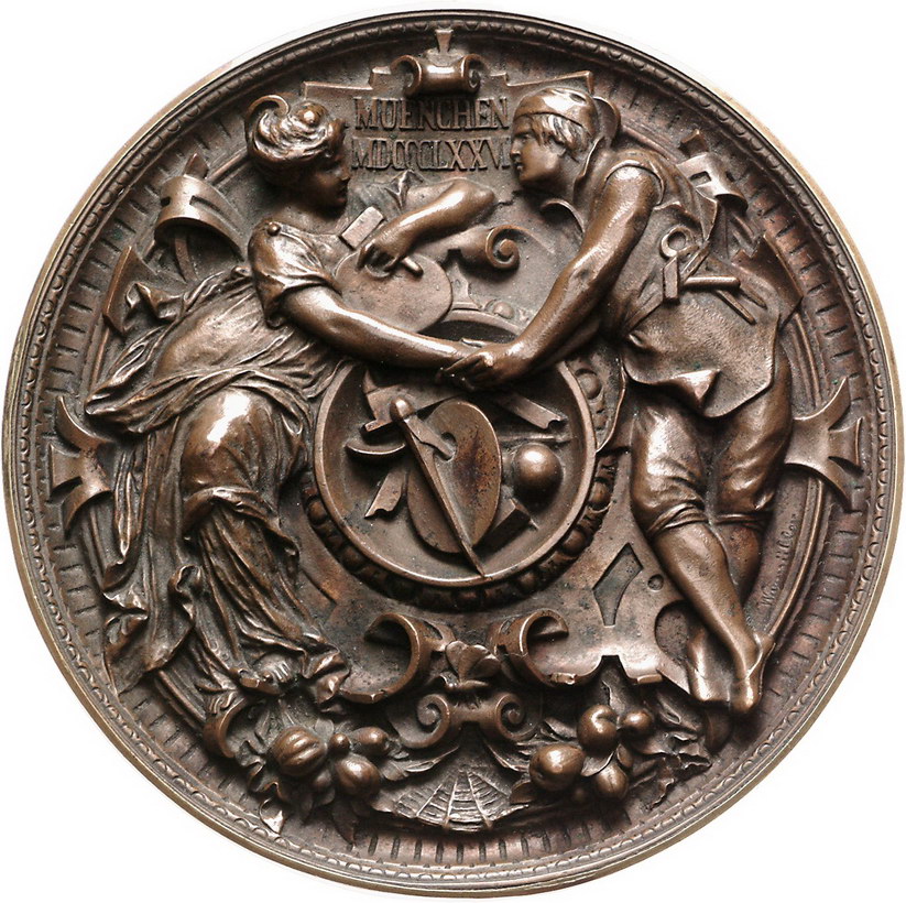Los-Nummer: Auktion 51 - 152 Altdeutsche Münzen und Medaillen Bayern-München, Stadt Bronzehohlmedaille 1876. Auf die Kunstgewerbeausstellung. Weibliche und männliche Figuren reichen sich über Werkzeug die Hände, oben Kartusche mit Schrift / Gewölbter Grund mit zwei Zeilen Schrift zwischen Eichen- und Lorbeerzweig. Hauser 549. 106,5 mm. Stark erhabene Arbeit. Vorzüglich Schätzpreis: 250,- Zuschlag: 200,- |