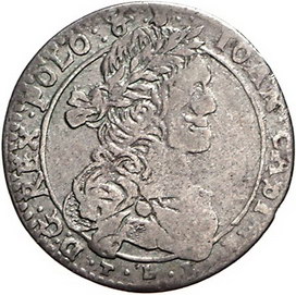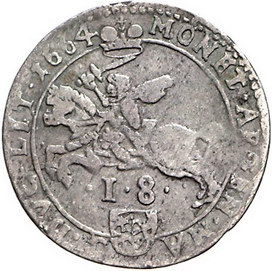 Los-Nummer: Auktion 51 - 2873 Ausländische Münzen und Medaillen Baltikum-Litauen Johann Casimir von Polen 1649-1668, 18 Gröscher 1664. Belorbeertes Brustbild nach rechts / Litauischer Reiter über Wert und Wappen. Mit Innenkreisen. Gumowski 1888, Kopicki 3626. Fast sehr schön / sehr schön Schätzpreis: 1250,- Zuschlag: 1000,- |