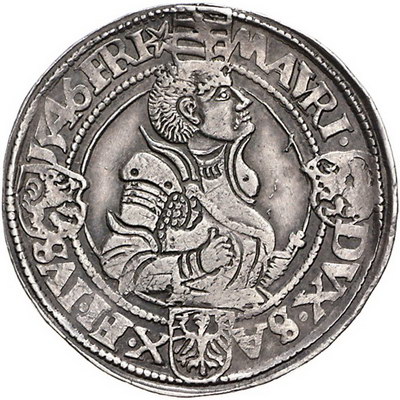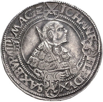 Los-Nummer: Auktion 51 - 1531 Altdeutsche Münzen und Medaillen Sachsen-Kurfürstentum Johann Friedrich und Moritz 1541-1547, Taler 1546, Freiberg. Münzzeichen Stern. Keilitz 192, Slg. Merseburger 524, Schnee 112, Davenport 9730, Schulten 3131. Sehr schön - vorzüglich Schätzpreis: 400,- Zuschlag: 360,- |