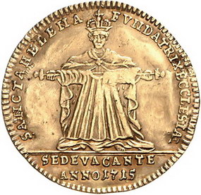 Los-Nummer: Auktion 51 - 1836 Altdeutsche Münzen und Medaillen Trier, Erzbistum Sedisvakanz 1715, Doppeldukat 1715. In einer runden verzierten Kartusche der Heilige Petrus / Gekrönte St. Helena mit dem Heiligen Rock. v. Schrötter 930, Friedberg - , vergl. Blätter für Münzfreunde 61, 1926 Seite 391 (Dort werden irrtümlich zwei Vierdukaten angegeben. Gemeint sind aber zwei Zweidukatenstücke, Vierdukatenstücke sind nicht bekannt). Das einzige von zwei geprägten Exemplaren im Handel. Fassungsspuren, sehr schön Schätzpreis: 7500,- Zuschlag: 12250,- |