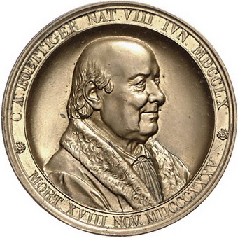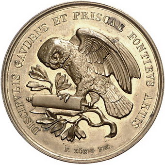 Los-Nummer: Auktion 51 - 2427 Medaillen Numismatik Personen Boettiger, Karl August *1760 Reichenbach, +1835 Dresden, Vergoldete Bronzemedaille 1835, von König. Auf seinen Tod. Brustbild nach rechts / Eule auf Pergamentrolle. Slg. Merseburger 4485, Schmidt 247. 34,5 mm. Vorzüglich - Stempelglanz Schätzpreis: 125,- Zuschlag: 190,- |