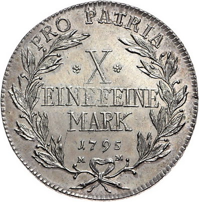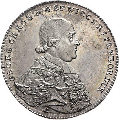 Los-Nummer: Auktion 51 - 1932 Altdeutsche Münzen und Medaillen Würzburg, Bistum Georg Karl von Fechenbach 1795-1802, Taler 1795. Kontribution. Brustbild nach rechts, darunter Stempelschneidersignatur OE / Wert und Jahr in einem oben geöffneten Kranz. Helmschrott 956, Davenport 2914. Prachtexemplar. Schöne Patina. Vorzüglich - Stempelglanz Schätzpreis: 1250,- Zuschlag: unverkauft |