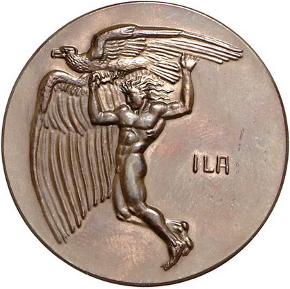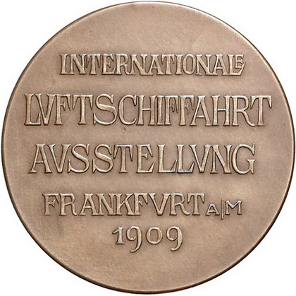 Los-Nummer: Auktion 51 - 2323 Medaillen Luftfahrt Bronzemedaille 1909, von Ludwig Eberle. Auf die Internationale Luftfahrtausstellung (ILA) in Frankfurt. Ganymed wird von Adler in die Höhe getragen / Fünf Zeilen Schrift. Button 58, Gutt 64. 43 mm. Vorzüglich + Schätzpreis: 175,- Zuschlag: unverkauft |
