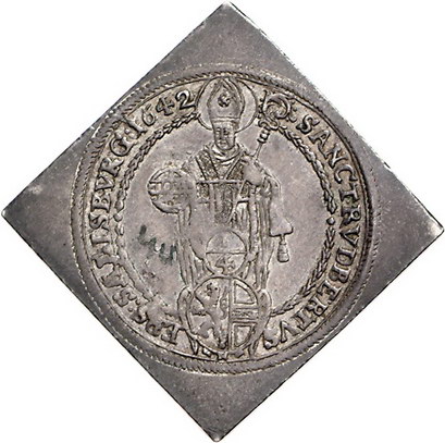 Los-Nummer: Auktion 51 - 2237 Haus Habsburg Salzburg, Erzbistum Paris von Lodron 1619-1653, 1/4 Talerklippe 1642. Probszt 1275. Schöne Patina. Fast vorzüglich Schätzpreis: 200,- Zuschlag: 170,- |